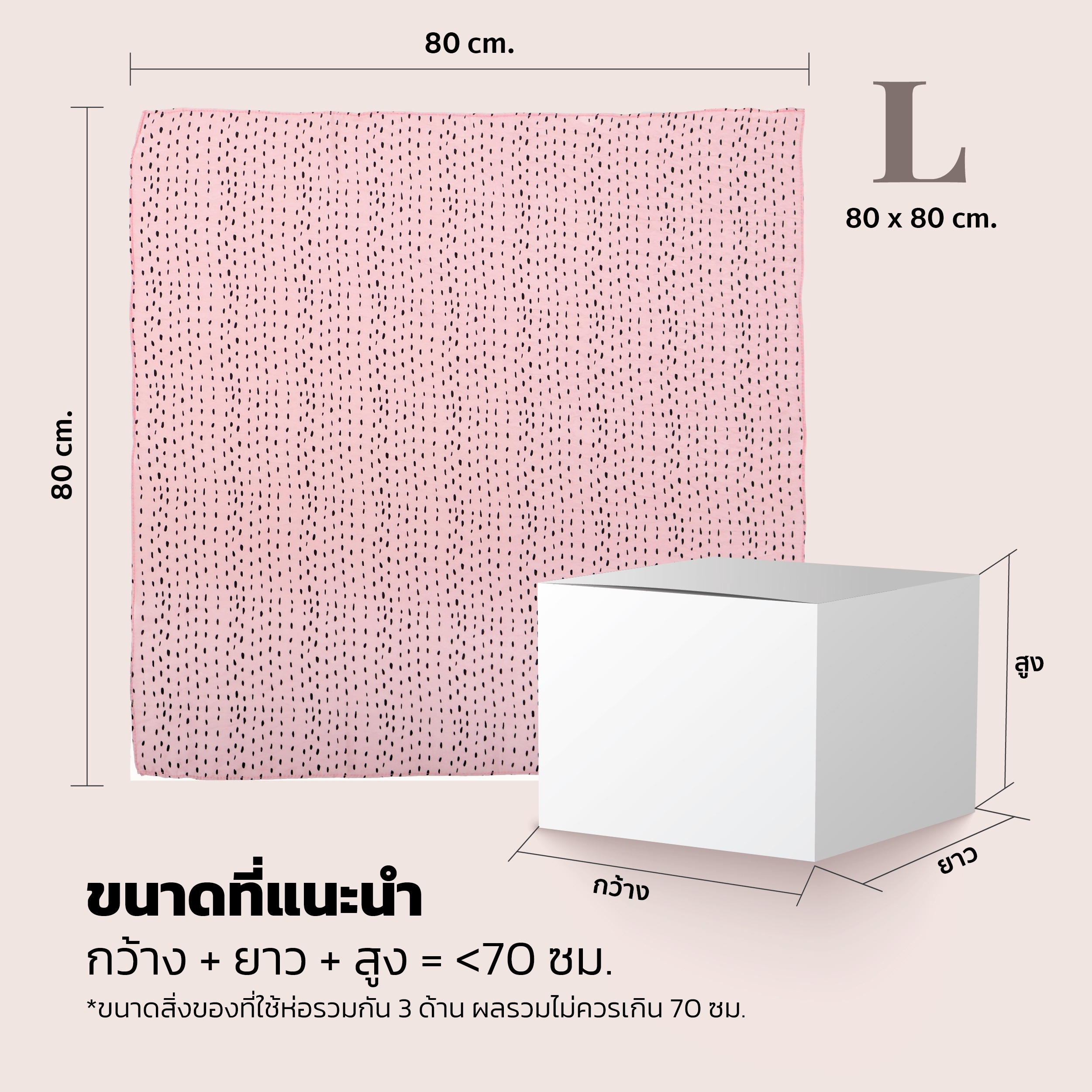 - L (80 x 80 cm) — ขนาดสิ่งของที่ใช้ห่อรวมกัน 3 ด้าน ผลรวมไม่ควรเกิน 70 ซม. เหมาะกับกล่องขนาดใหญ่ หรือของขวัญหลายชิ้น